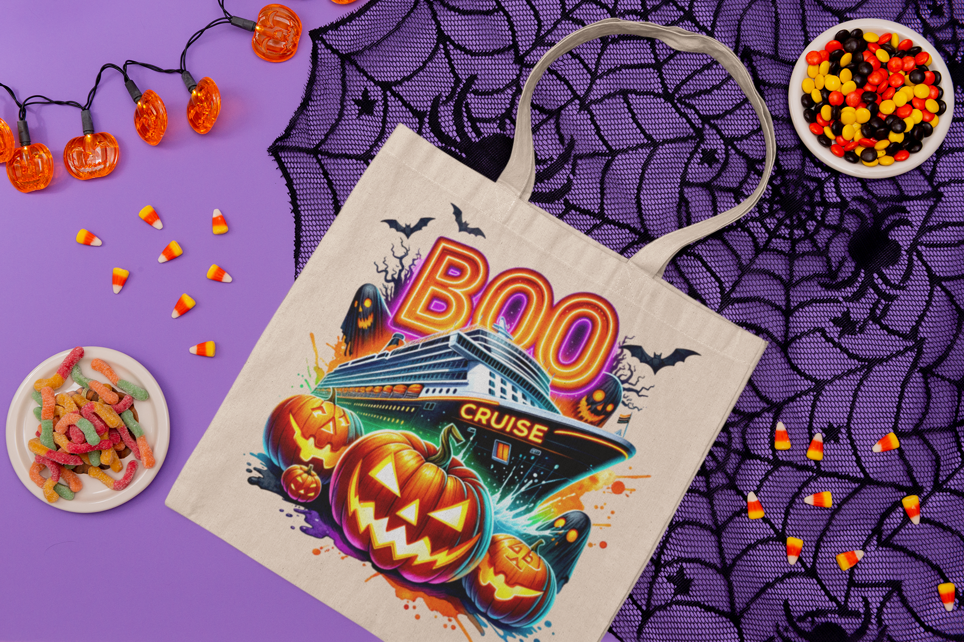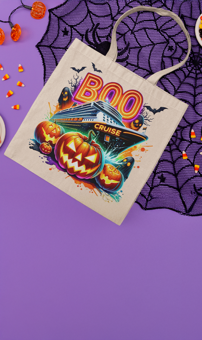 A bold Halloween tote built for candy hauls, cruise nights, and ghostly adventures.